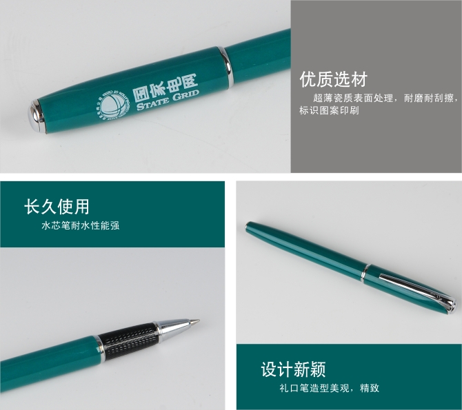 禮品筆:超薄的資質(zhì)表面處理,使該筆耐磨耐腐、耐刮花,產(chǎn)品馬面歷久彌新,凝脂如玉,永不磨損,極富質(zhì)感。訂質(zhì)產(chǎn)品加上國(guó)家電網(wǎng)LOGO,用琺瑯彩瓷術(shù),經(jīng)高溫?zé)贫,LOGO和國(guó)網(wǎng)綠色彩不易脫落,筆身流線型設(shè)計(jì),手感舒適