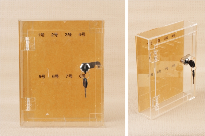 鑰匙箱背面可以垂直懸掛于墻面上,外附配鑰匙和鎖,保管好以防丟失。