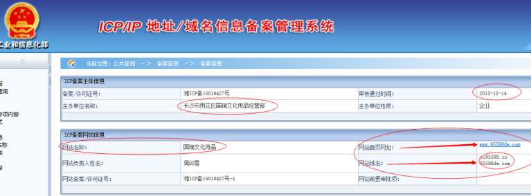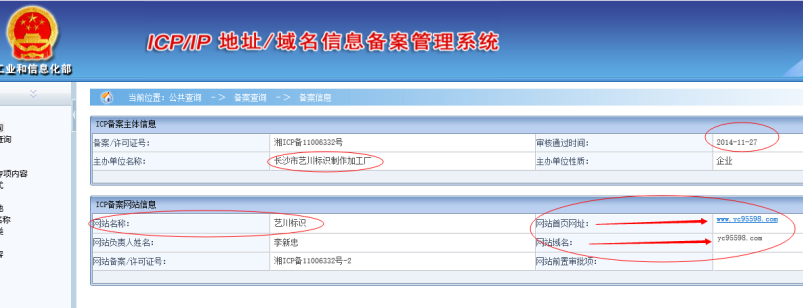 藝川標(biāo)識(shí)官網(wǎng)域名yc95598.com的工信部備案信息截圖