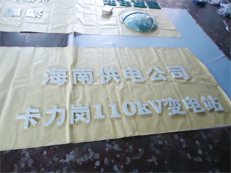 變電站地標案例圖:按國家電網(wǎng)VI標準將標志做成球形分塊模具;用樹脂材料注入模具摻入玻璃纖維,前后四層;具有高強度,耐高溫,不變形,使用年限長等特點;毛胚標志開模后進行粗磨修形,精磨后進行底漆、面漆4遍的打磨噴白色漆高溫爐烤后,單塊內(nèi)包裝,整體標志獨立裝箱;中間內(nèi)圓與圈外中英文分開,標志周邊小字、大字和英文字都用PVC結(jié)皮板雕刻再噴國網(wǎng)綠漆,底板采用鋁塑板。